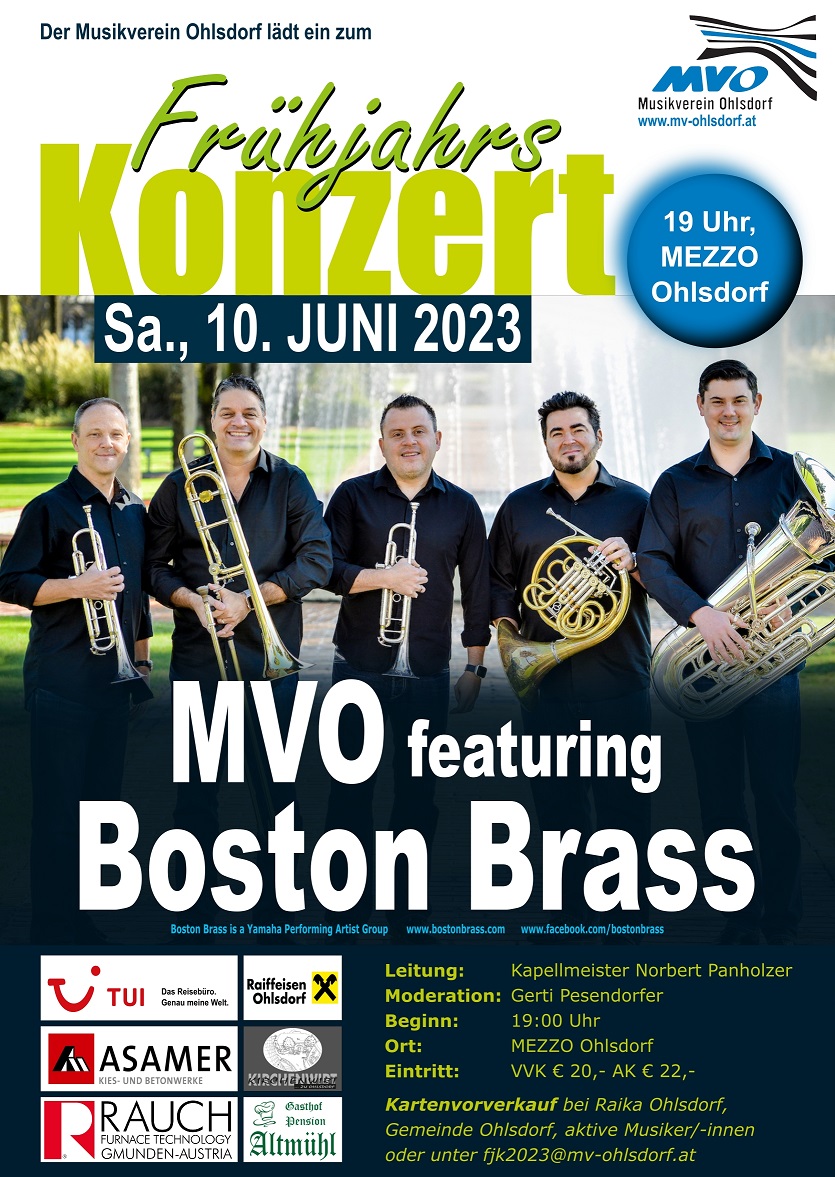 Am 10. Juni 2023 fand im MEZZO Ohlsdorf ein gemeinsames Konzert von Boston Brass und dem Musikverein Ohlsdorf statt. Die renommierte Fünf-Mann-Gruppe Boston Brass war bereits mehrmals in Ohlsdorf zu Gast und hat eine enge Verbindung zu Johannes Ohrlinger und dem Musikverein. Gerti Pesendorfer führte charmant durch das Programm und bot interessante Hintergrundgeschichten zu den Stücken. Unter der Leitung von Kapellmeister Norbert Panholzer